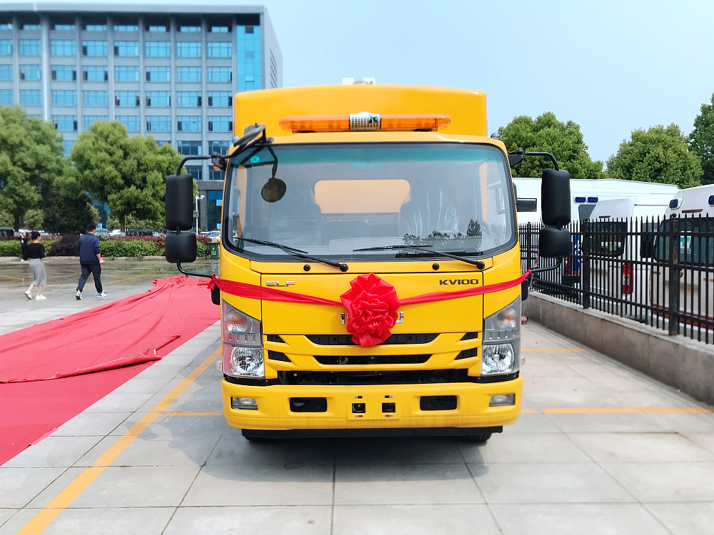 选装配置:选装行李架、爬梯、车顶工作台;选装不同形状、结构的警示灯;选装中隔断(可选择开门)、车身两侧可选开上掀门、盲窗、侧开门;花纹铝板;加装设备工具柜、配电箱、发电机组、水泵、电焊机、空压机等线路安装外接电源系统、(室内灯光照明、探照灯、高杆照明灯等);绕线盘,还可根据用户不同需求加装不同的维修抢险设备、车身制作专用图案或标识。