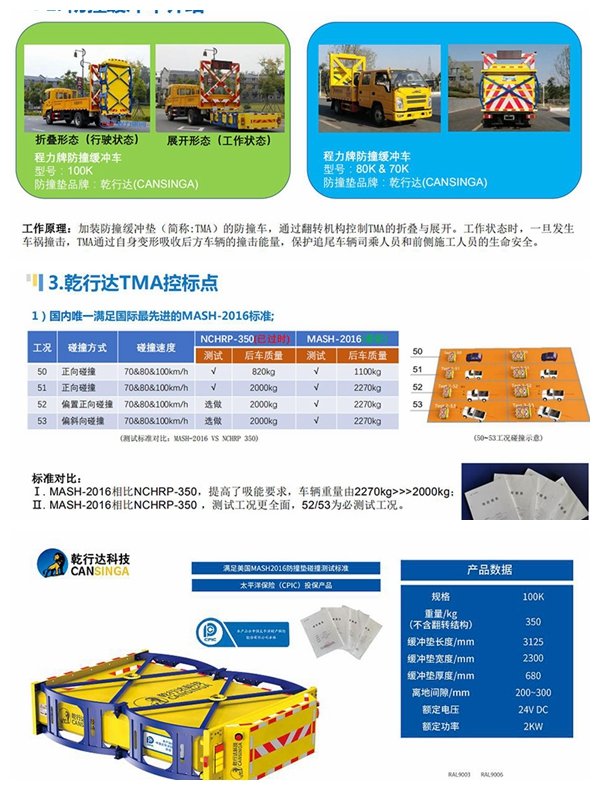 护箱采用Q235国标边3mm底板花纹板4mm厚,箱体后部防撞缓冲模块包采用国际知名技术产品100K防撞缓冲模块,防撞缓冲吸能模块主要由车载防撞缓冲垫和导向标志架组成,充当施工作业车辆后方的缓冲卫士。如若发生追尾事故,能够在肇事车辆和前方施工作业区域之间构建一个缓冲区域,通过机具结构变形吸收撞击的能量,最大限度地降低被保护人员及设备遭到碰撞的几率。高性能液压系统,可实现快速举升和落下操作,方便设备运输转场,一键启动功能,举升和落下防撞装置,当防撞装置未完全落下到工作位置或举升到垂直运输位置时,会有自动警告音提示。