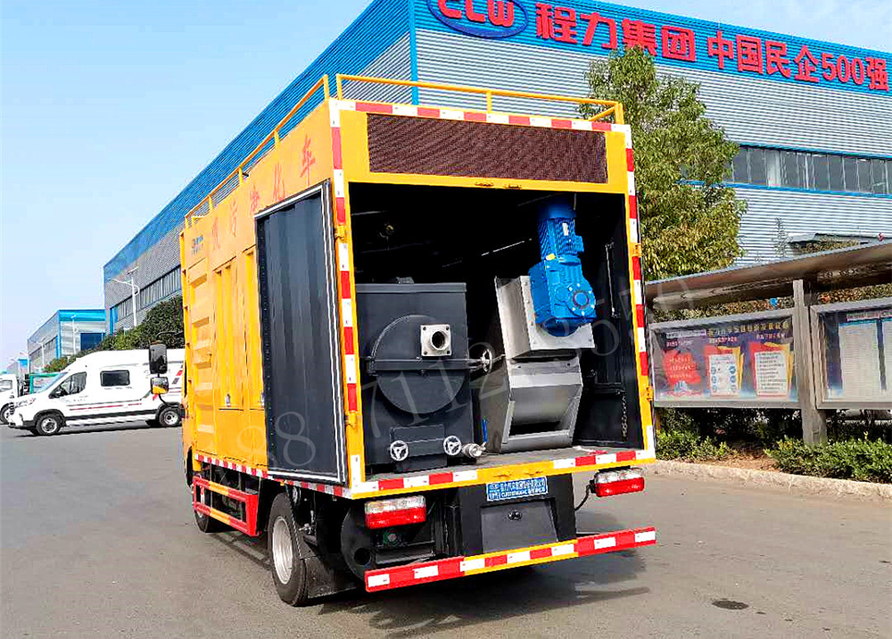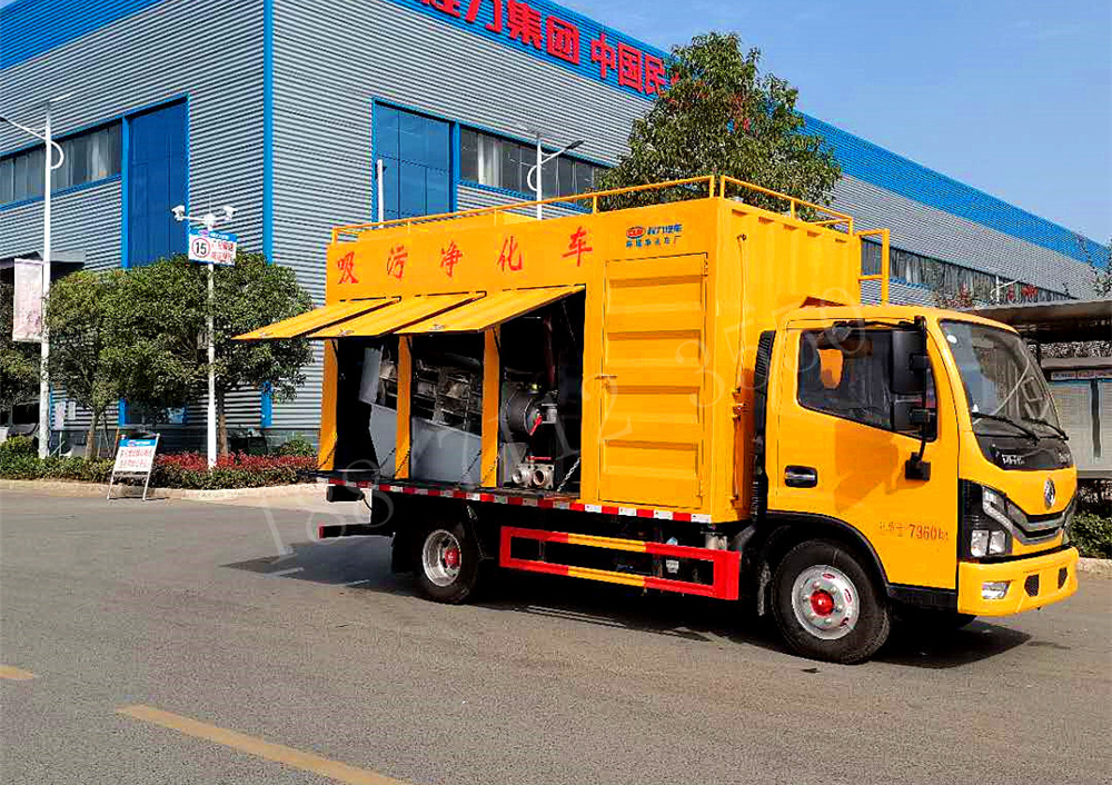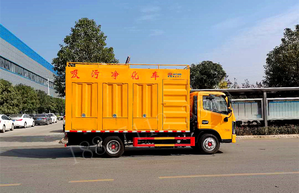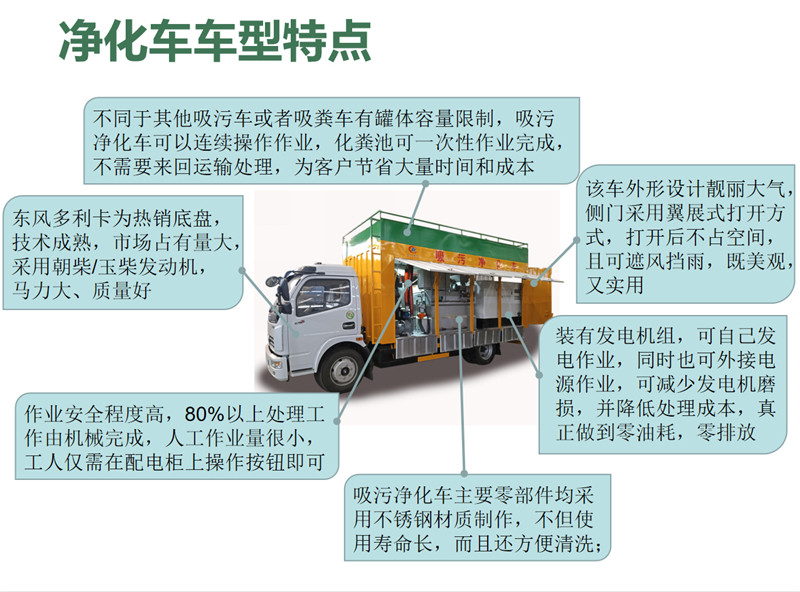 吸污净化车通过水环真空泵将化粪池的污物自吸入分离箱中,通过分离箱中的滚筒,将污物中不可降解的无机物分离出来,并甩干;分离后的污水经过顶部污水箱自流至絮凝槽,同时加药箱中的药水通过加药泵注入絮凝槽,分离后的污水和药水在絮凝槽中充分反映凝结后,自流至叠螺机,进行叠螺脱水,从而将污水中的粪便压榨成饼,排出达标污水。该车型对所有可絮凝的污水,均能很好的处理。