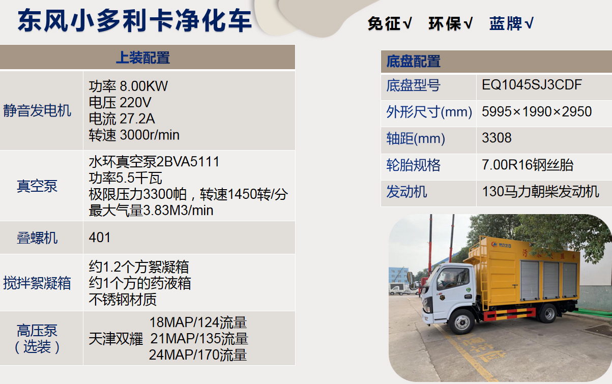 一、底盘配置: 采用东风多利卡EQ1045SJ3CDF车身,配置玉柴发动机马力,国六排放标准,轴距3308(mm),整备质量0吨,额定载质量0吨,五挡变速箱,带原厂空调,该车上蓝牌,城区道路不限行。